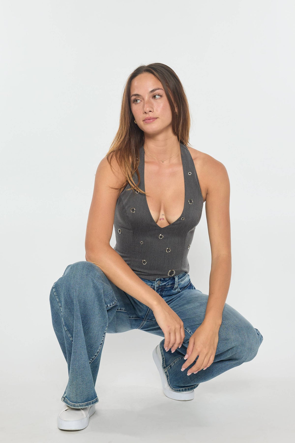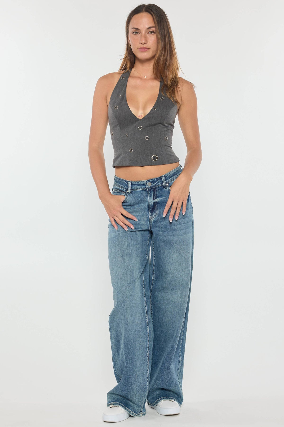 These mid-waist wide-leg jeans feature a relaxed, baggy fit crafted with a heavy brushed potassium wash accentuated by subtle whiskering, hand sanding, tacking, and grinding details. Designed with a single button closure and zipper fly, they offer a clean hem for a refined finish. Made from a comfortable blend of 85% cotton, 8% polyester, 5% rayon, and 2% spandex, these jeans combine durability and stretch. With a 32” inseam and a 22” leg opening, they balance style and comfort effortlessly.